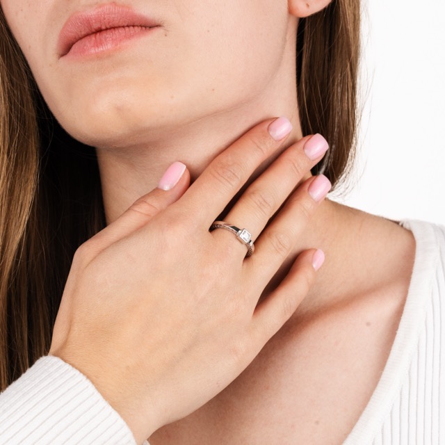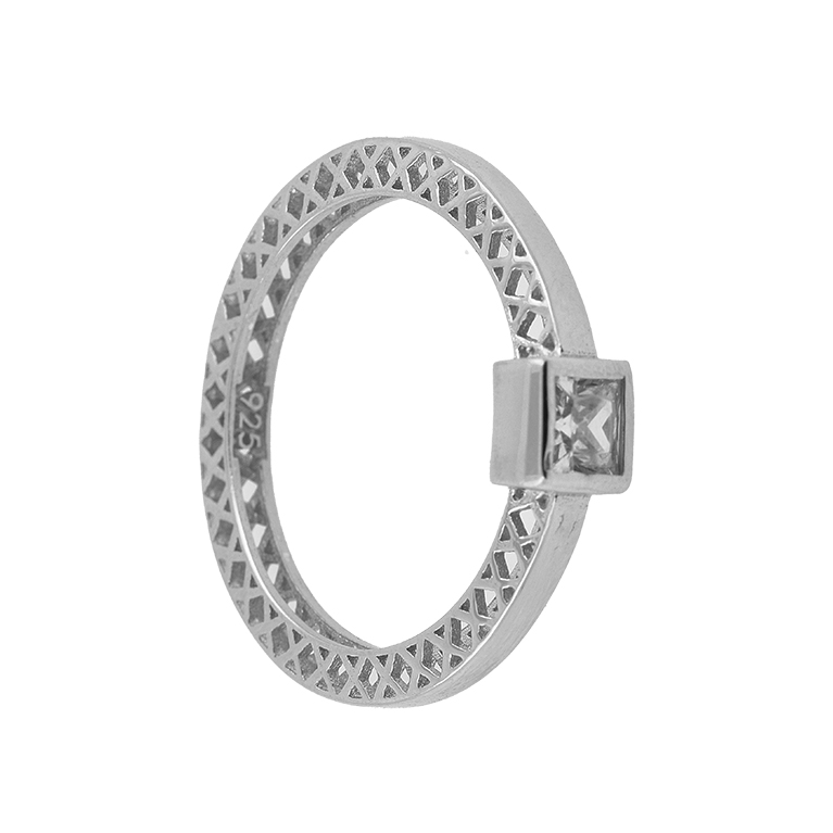 Ring in Silver with a Large Square Cubic Zirconia Stone and a Beautiful Carved Bezel in Her Fashion